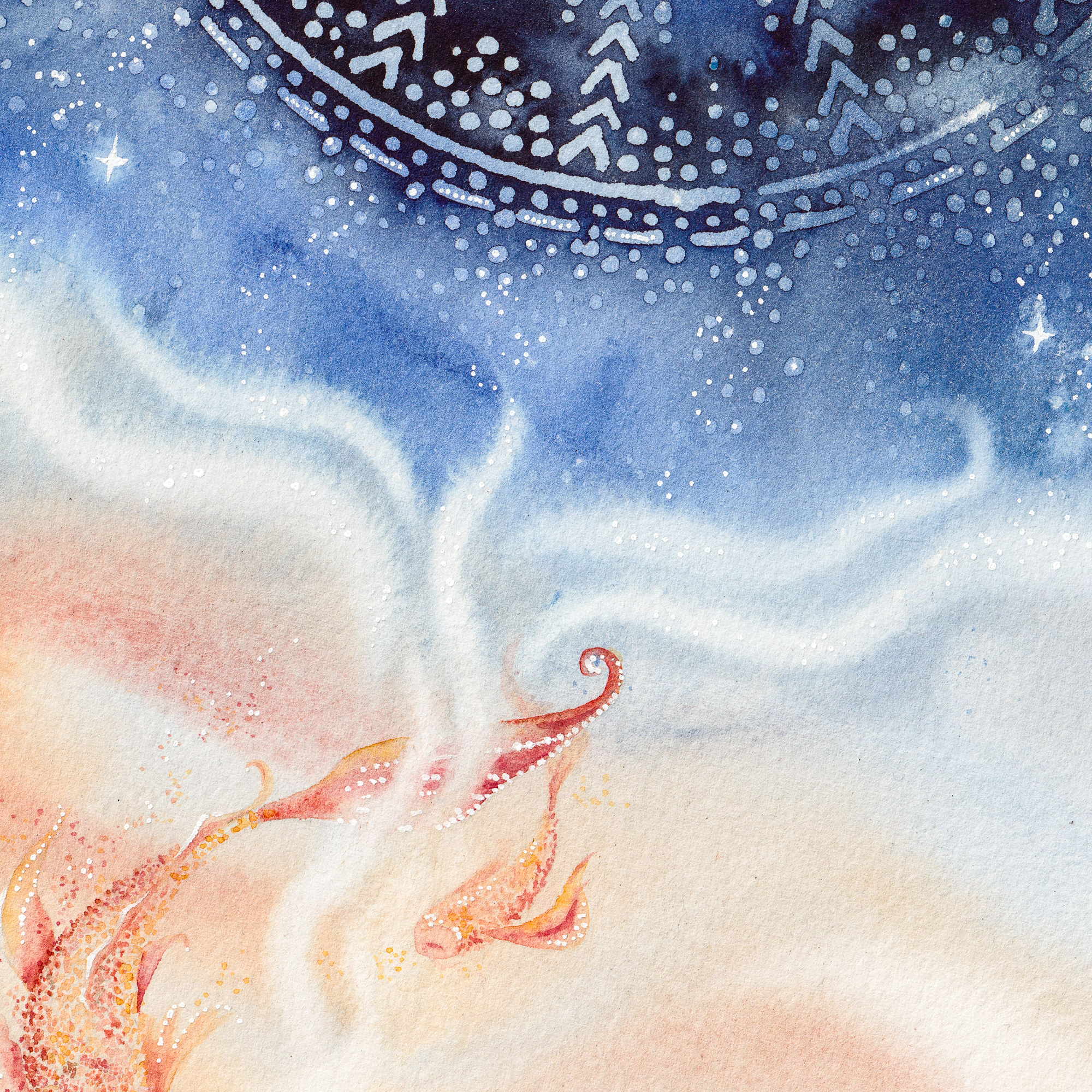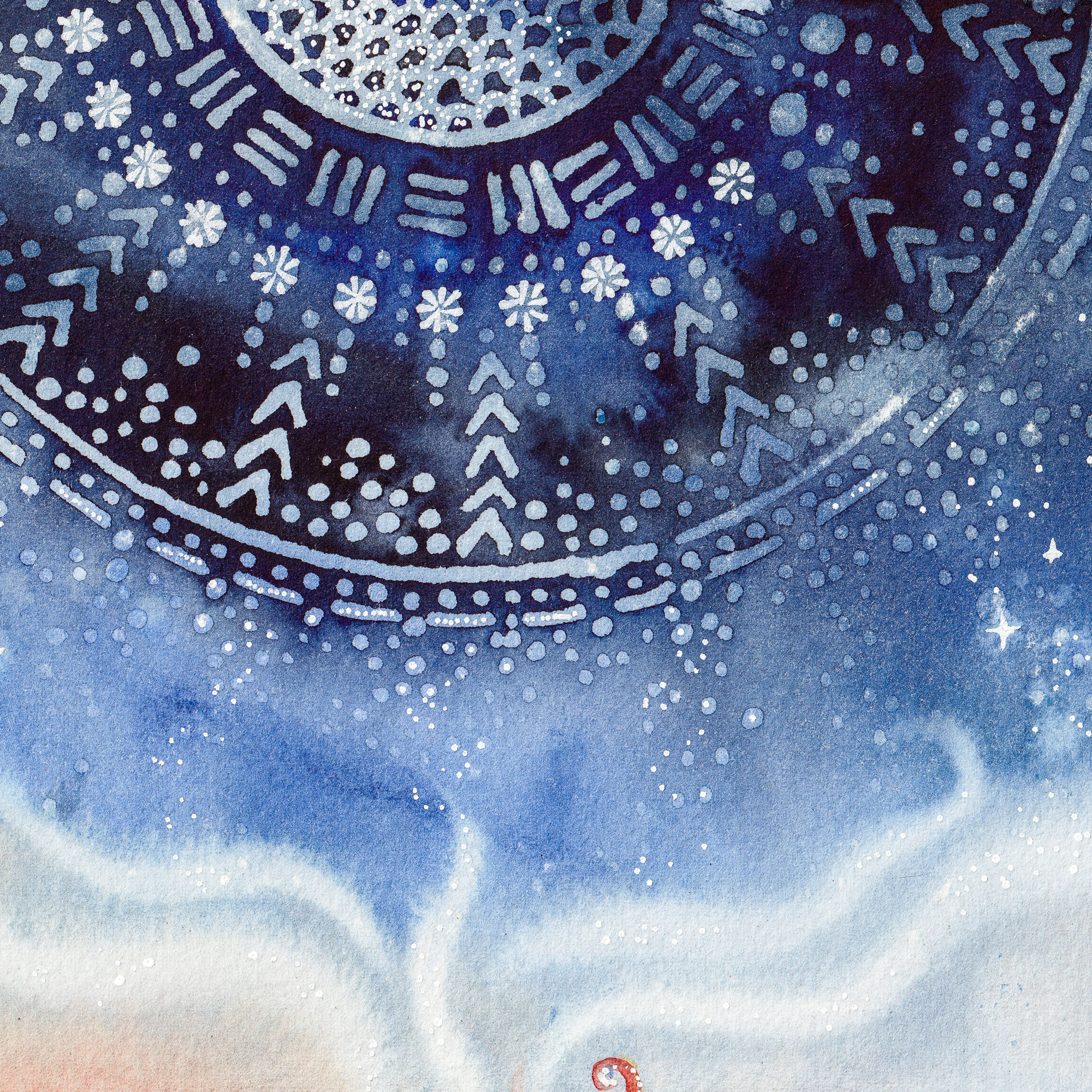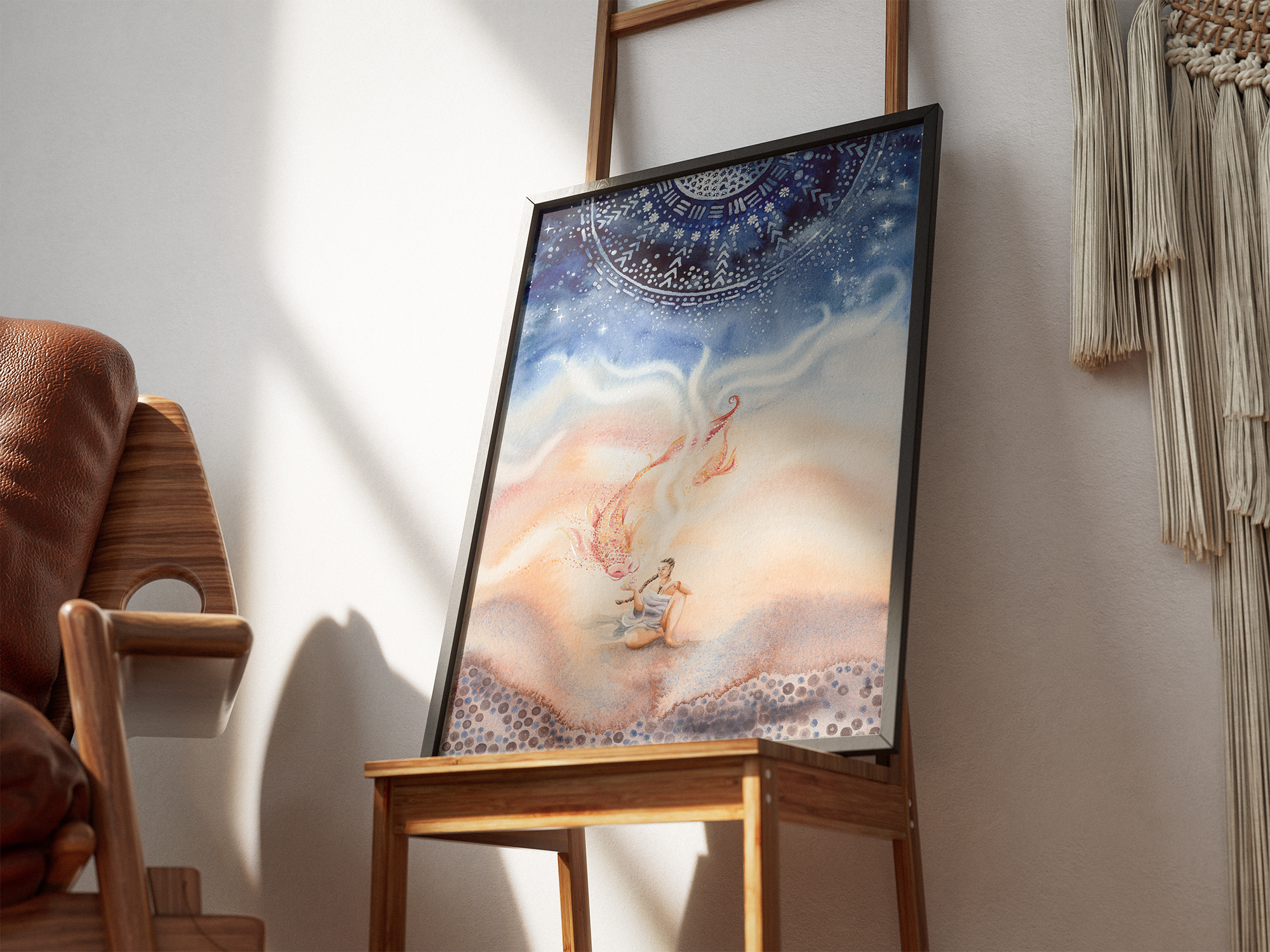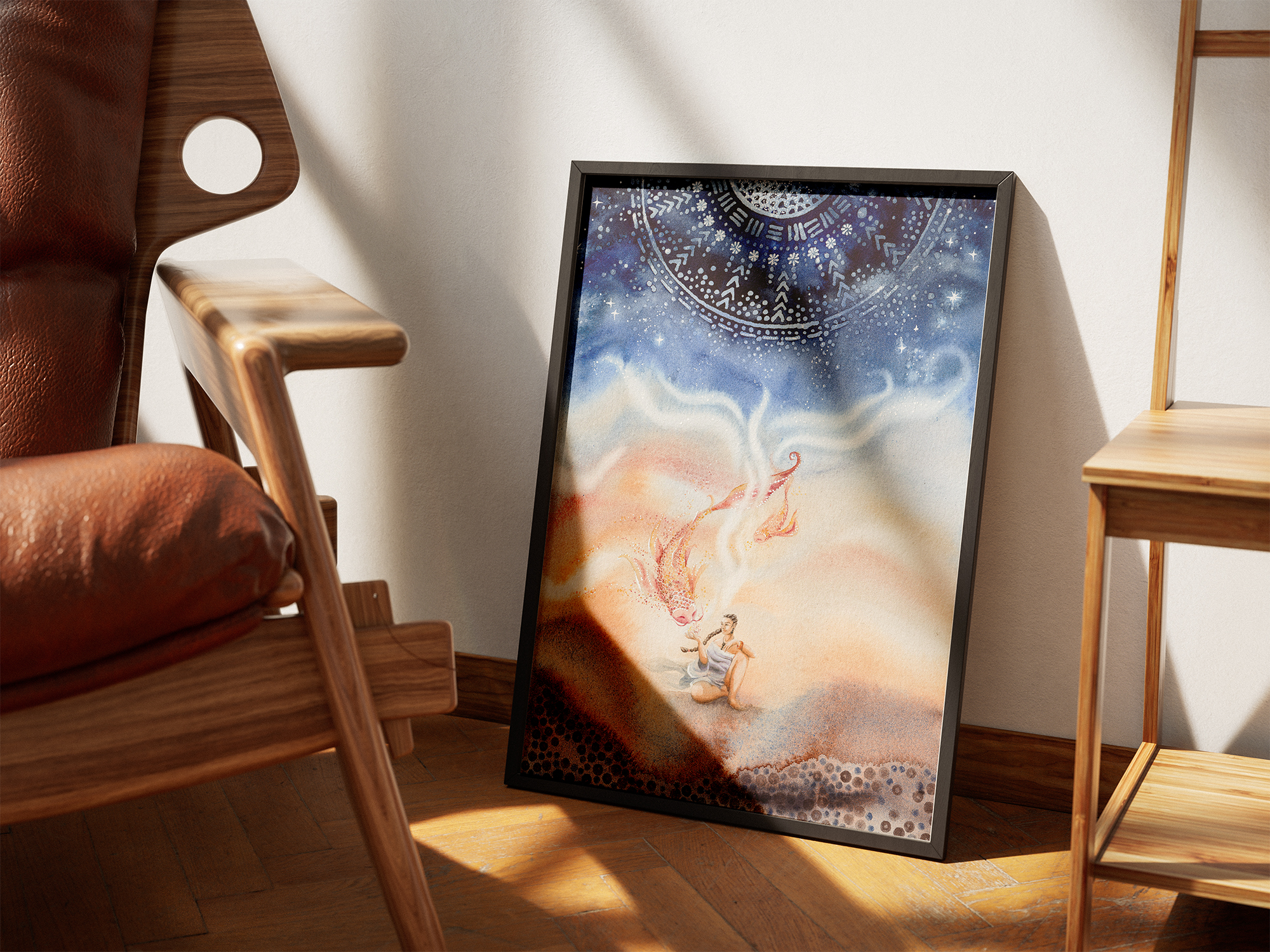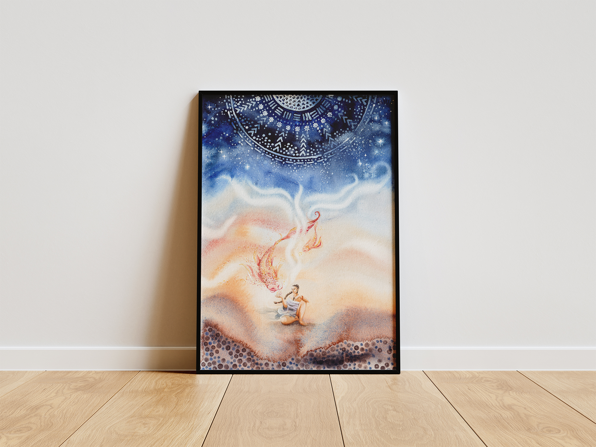 Limitierter Artprint mit Hüterin in Wüstenlandschaft umgeben von tanzenden Himmelskois und kosmischem Mandala. Persönlich gedruckt mit farbintensiver Tinte auf Recyclingpapier, auf 33 Drucke limitiert. In Din A5, A4 oder A3 erhältlich.