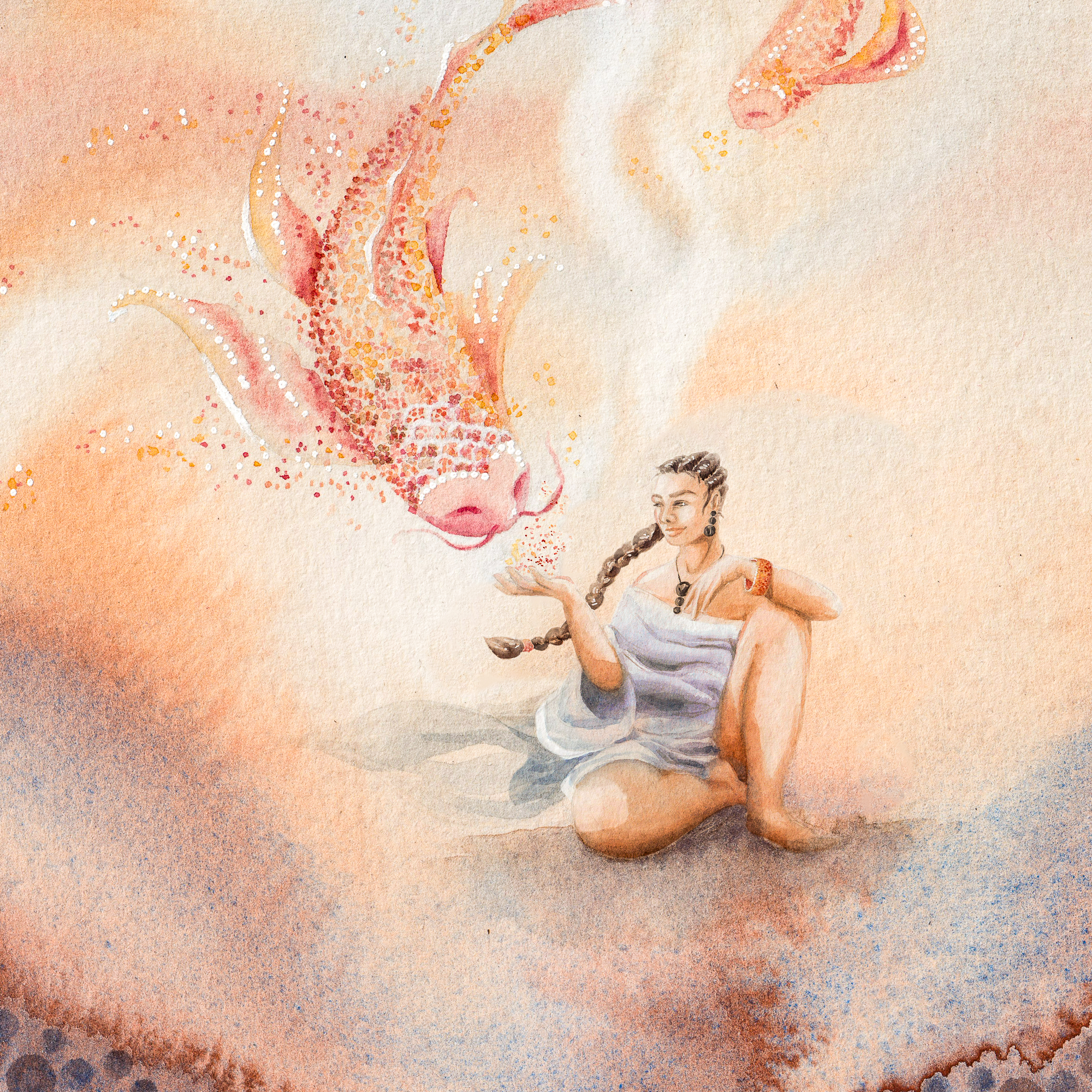 Sie erinnert dich daran, dass selbst in der größten Weite ein Strom des Lebens fließt – sichtbar in deinen Träumen, unsichtbar in deiner Seele. Aus der Tiefe deiner Magie fütterst du die kosmischen Fische, die zwischen Himmel und Erde tanzen.