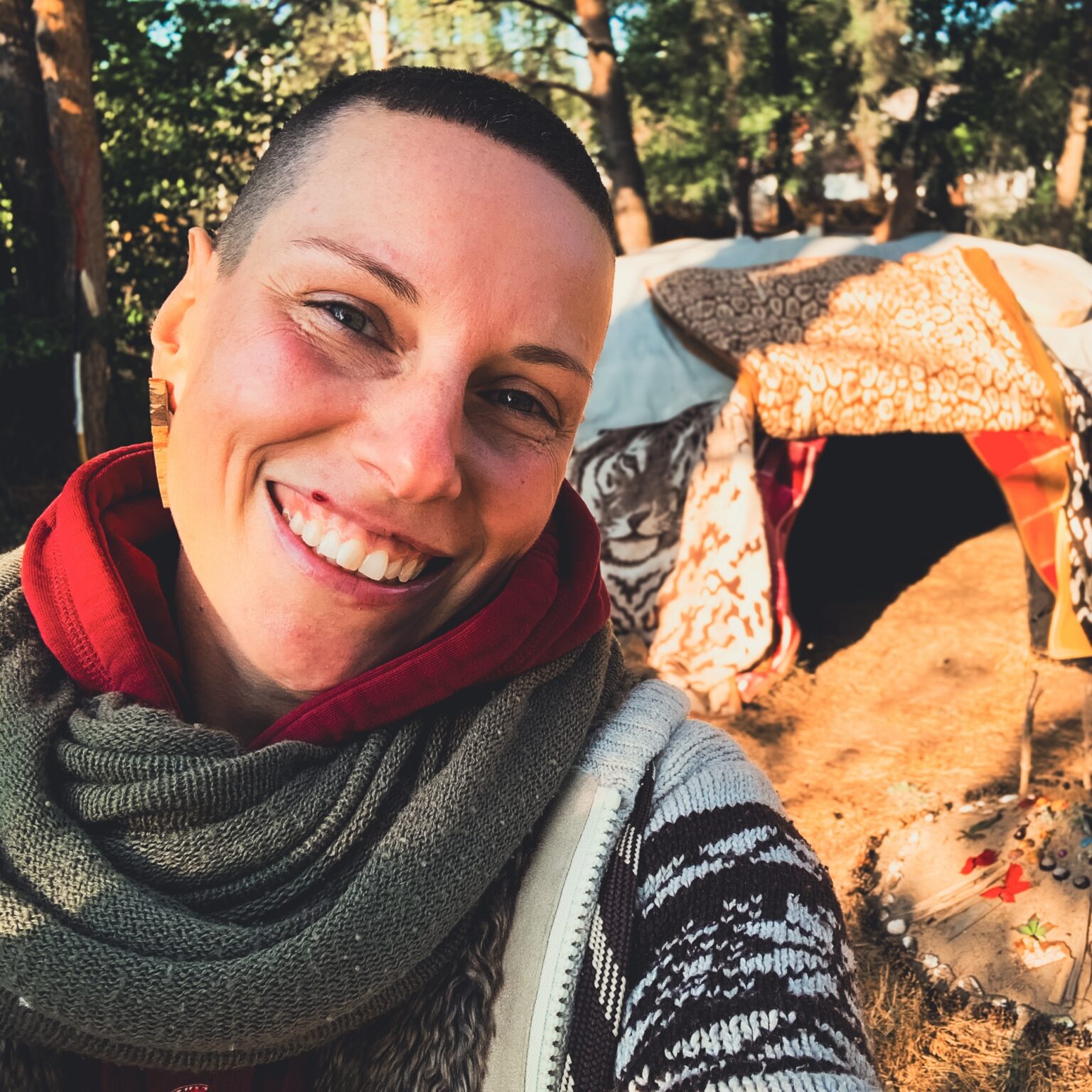 Wir ziehen uns am Feuer aus und treten nackt vor die Hütte. Ich bin aufgeregt, obwohl ich meine Angst dem Feuer übergeben habe. Jakob nimmt meine Hand und sagt: “Willkommen, Schwester.” Ich lächle, werde weich und fühle tiefes Vertrauen. Auf allen Vieren danke ich meinen Ahnen und krabble in die Hütte.