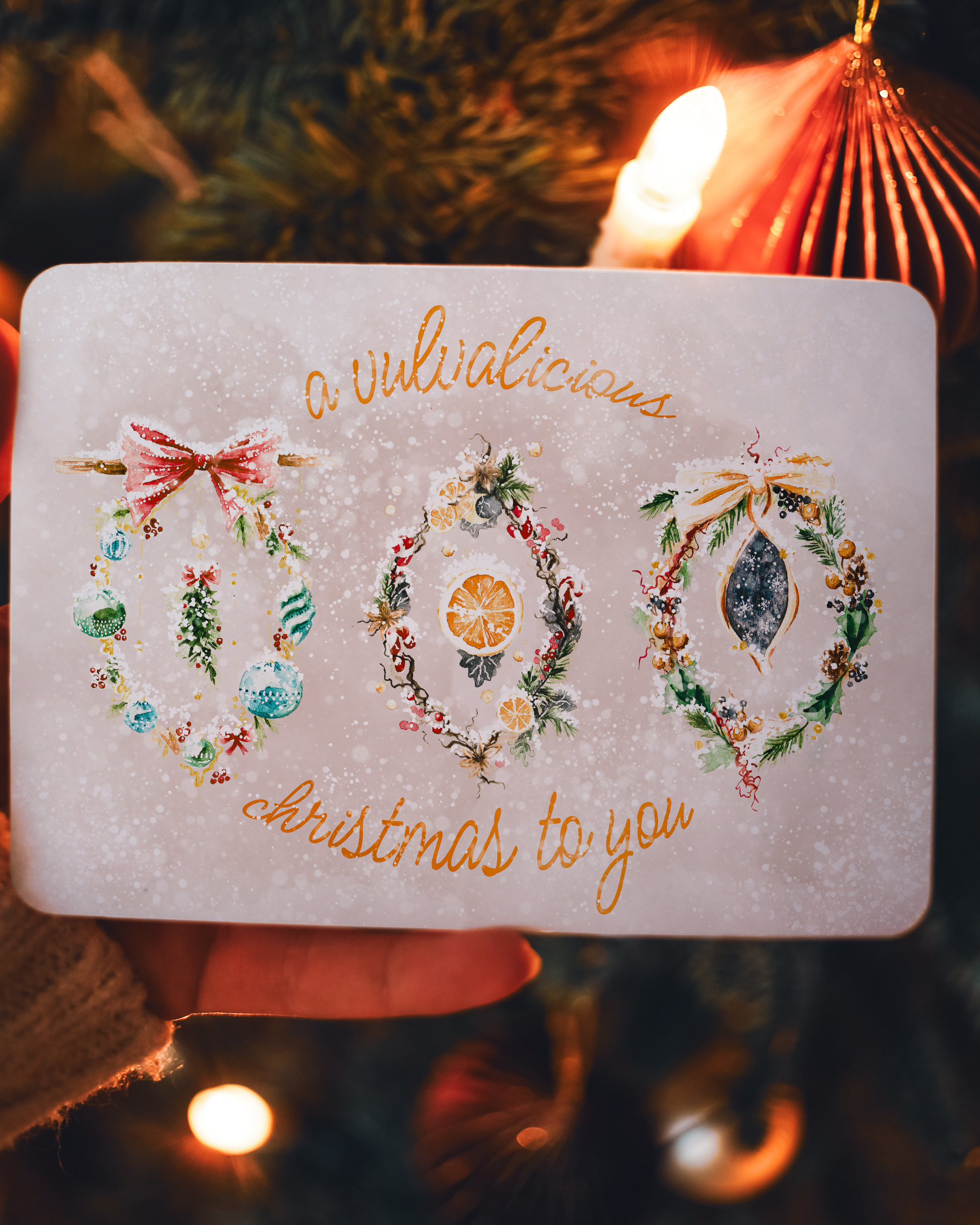 Ich verziere dir deine Vulvakarten per Hand mit gold glänzender Farbe – und zwar GRATIS! Damit erhalten dein vulvaschönen Weihnachtsgrüße einen individuellen und besonders magischen Touch.