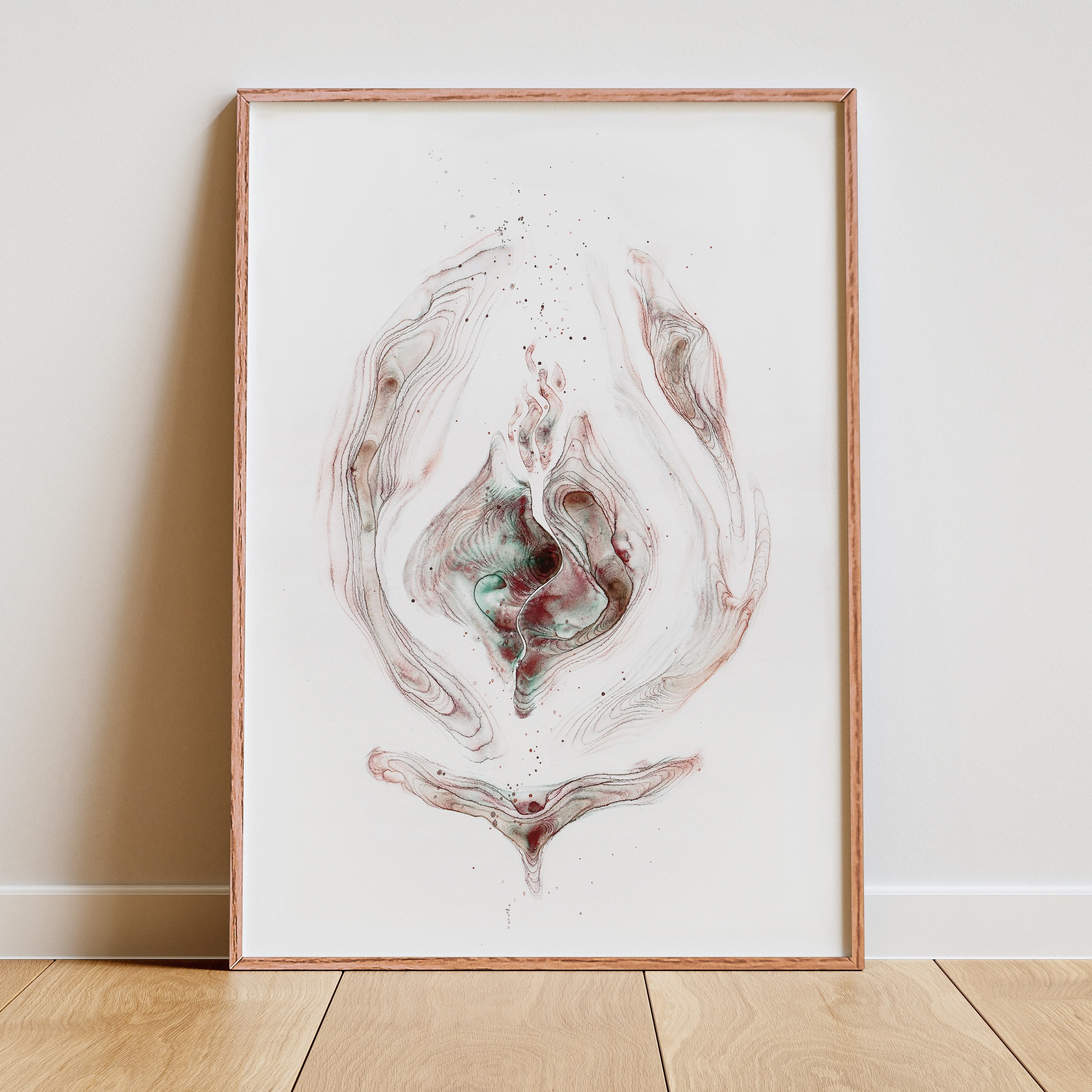 Dein Vulva-Unikat erhältst du im stabilen Holzrahmen mit Acrylglas – gut geschützt vor Feuchtigkeit und bereit, direkt an deinem Lieblingsplatz zu wirken.
