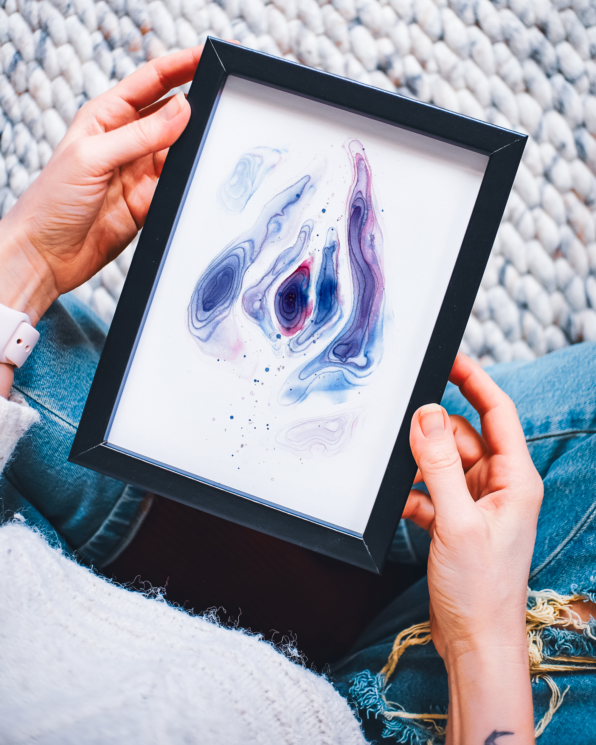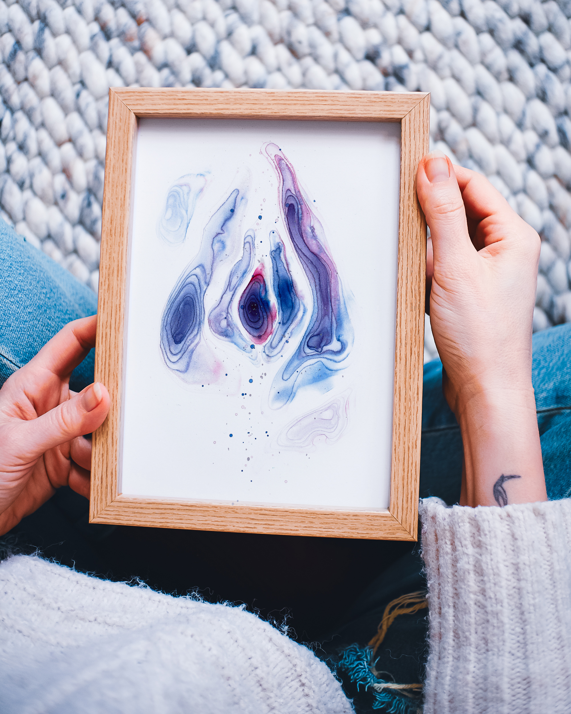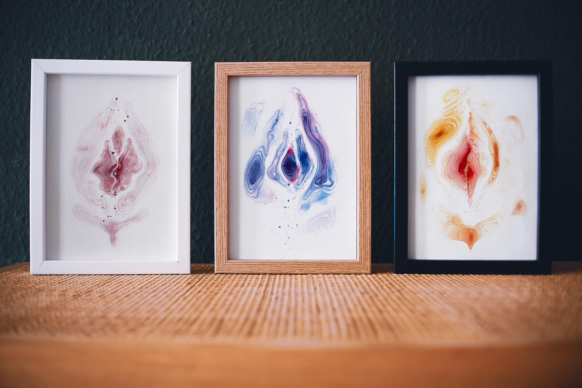 Dein Vulva-Unikat erhältst du im stabilen Holzrahmen mit Acrylglas – gut geschützt vor Feuchtigkeit und bereit, direkt an deinem Lieblingsplatz zu wirken.