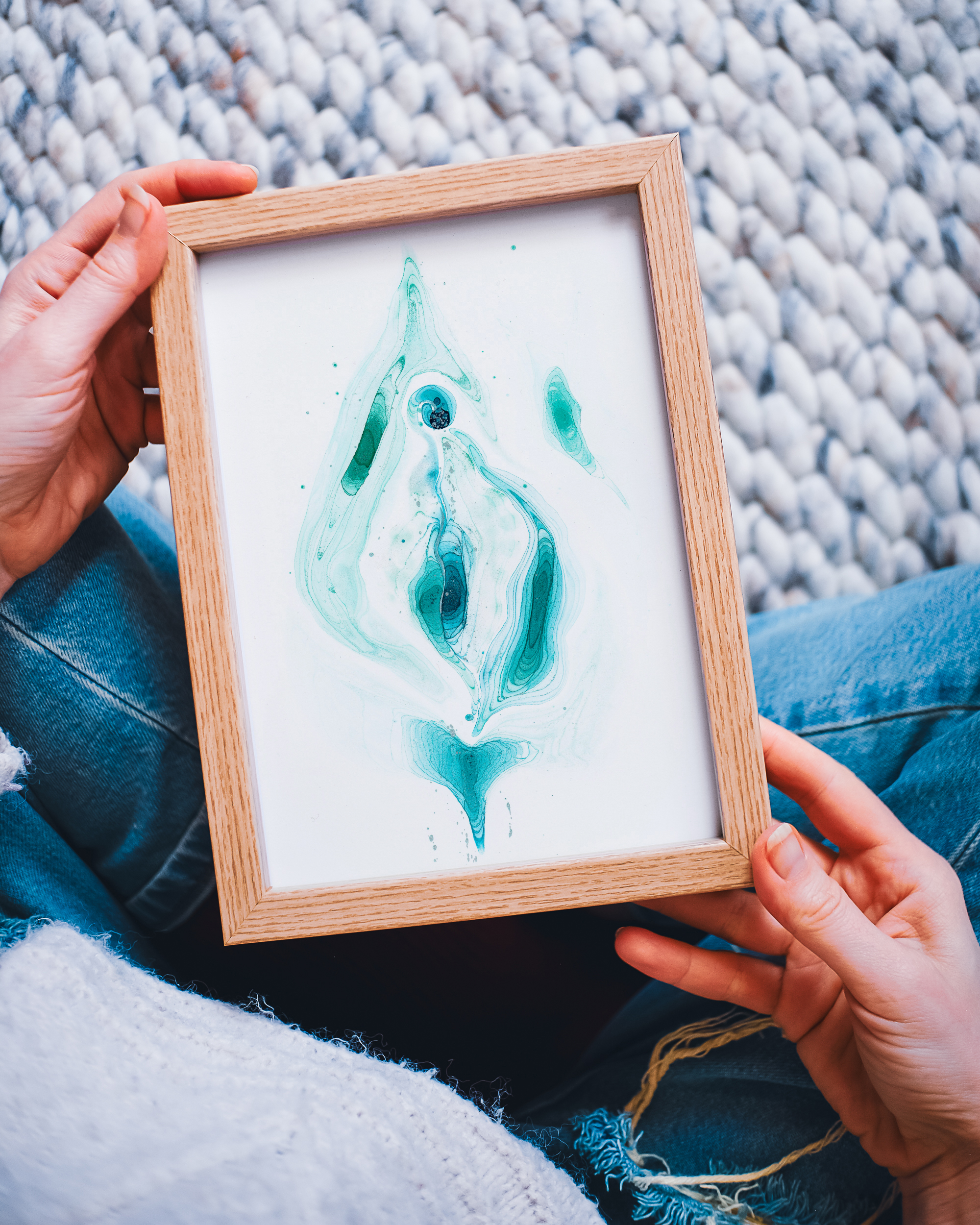 Dein Vulva-Unikat erhältst du im stabilen Holzrahmen mit Acrylglas – gut geschützt vor Feuchtigkeit und bereit, direkt an deinem Lieblingsplatz zu wirken.