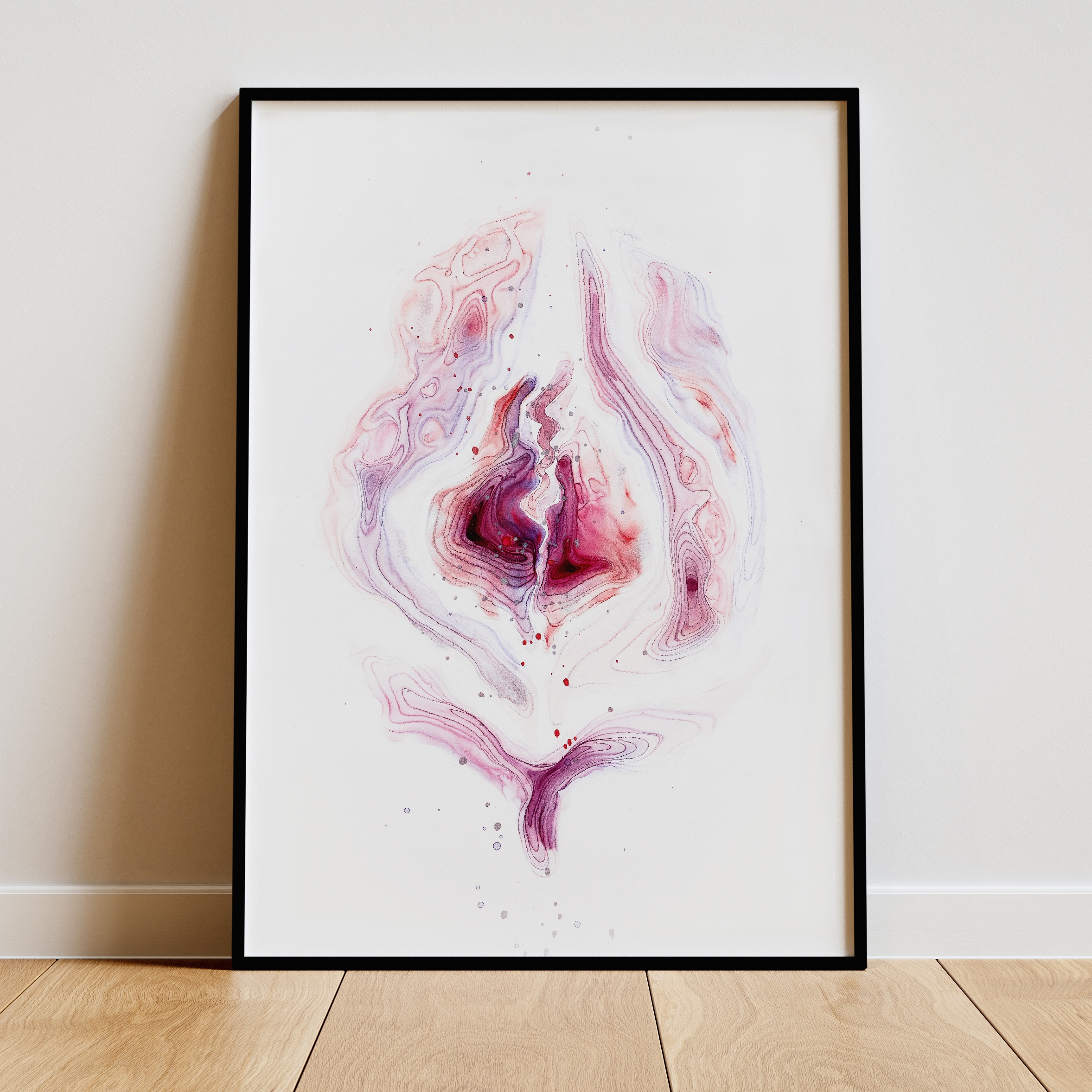 Dein Vulva-Unikat erhältst du im stabilen Holzrahmen mit Acrylglas – gut geschützt vor Feuchtigkeit und bereit, direkt an deinem Lieblingsplatz zu wirken.