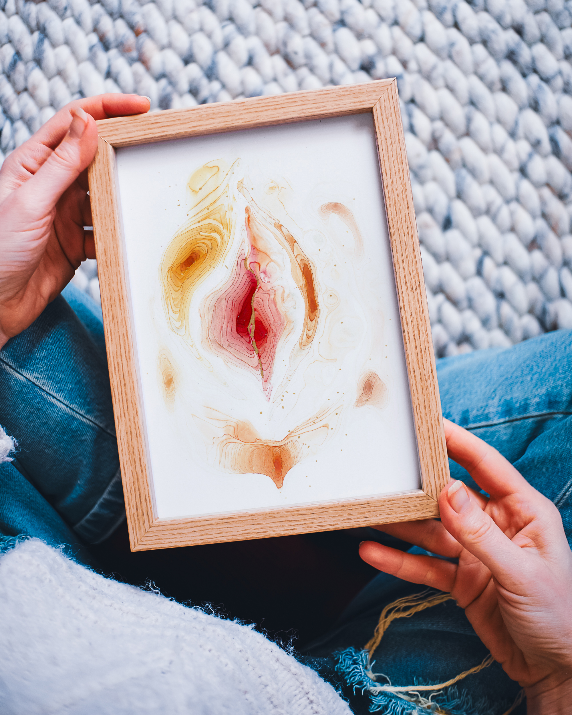 Dein Vulva-Unikat erhältst du im stabilen Holzrahmen mit Acrylglas – gut geschützt vor Feuchtigkeit und bereit, direkt an deinem Lieblingsplatz zu wirken.